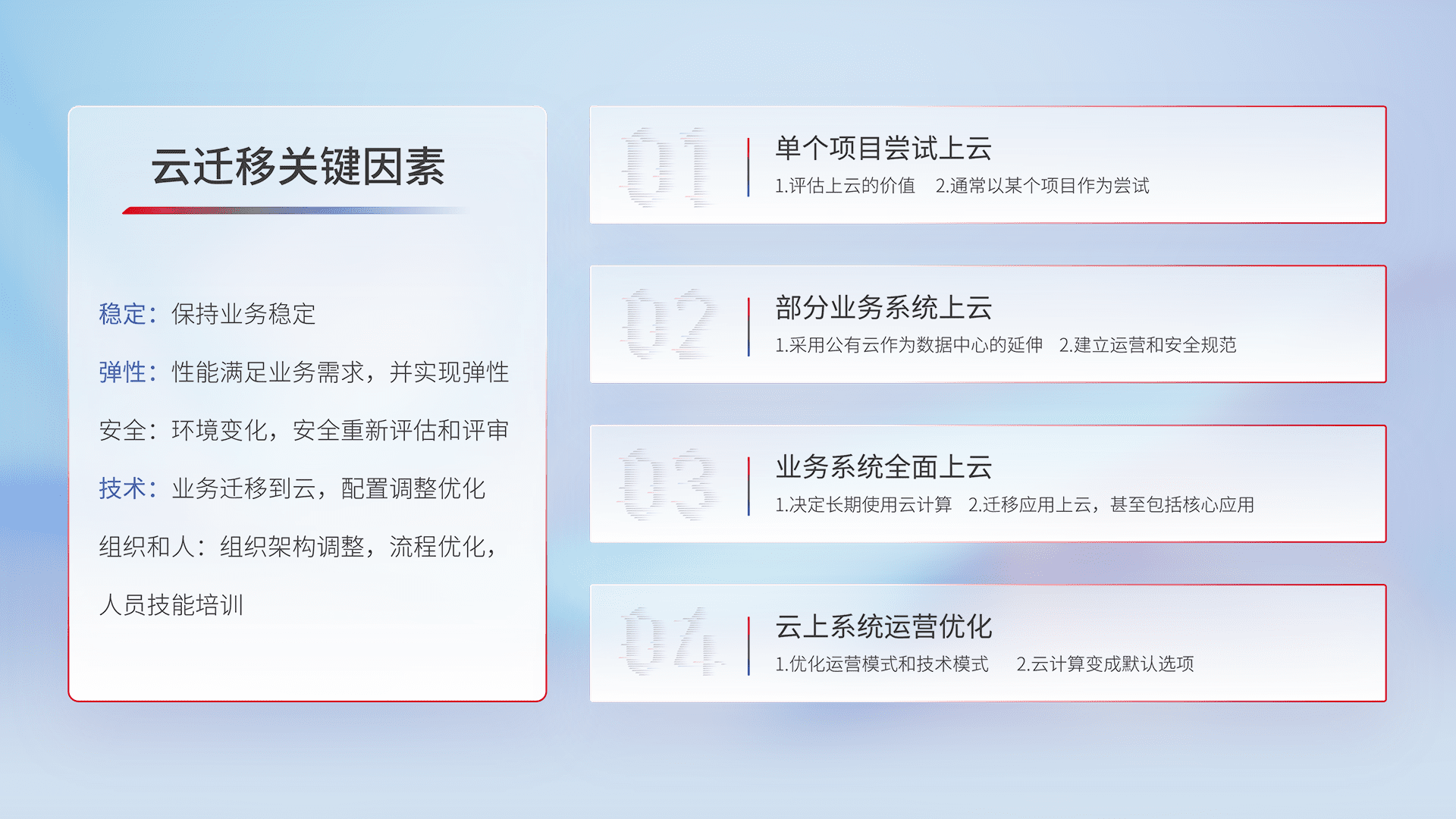 结合实际业务,,从规划设计、、云平台选型、、、云原生改造、、、数据迁移、、集成交付,,,,迁移全过程为客户识别最佳上云路径,,,,做好风险识别管理,,,设计网络架构、、、、身份权限、、安全审计合规、、、操作审计、、、日志审计、、监控告警策略、、、、多站点容灾设计等,,,对云上基础设施进行整体规划,,,,提升IT治理水平,,以满足弹性、、高可用、、、高性能的需求。。。
