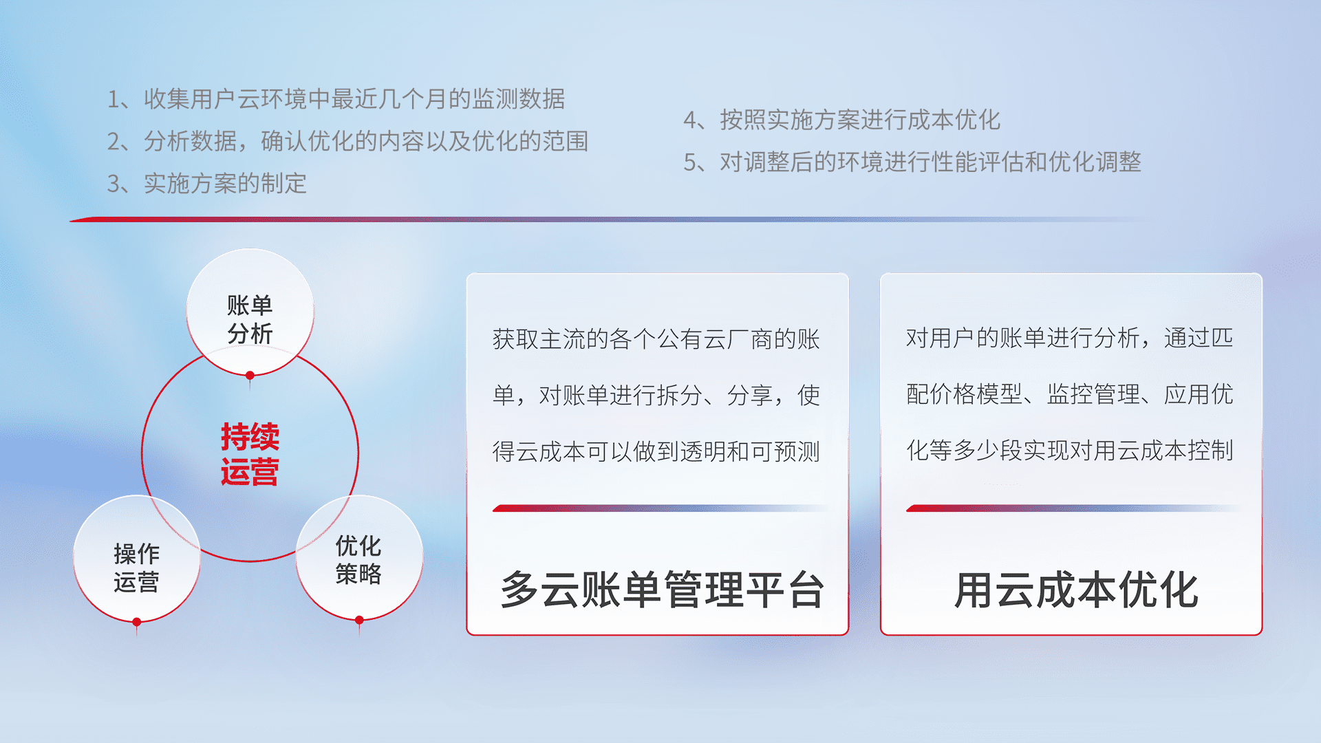 通过多云纳管,,,,以统一的资源数据模型把客户的云资源进行抽象和封装,,,进而实现对多云资源的统一操作,,保障云资源管理的可靠性、、、稳定性与可用性。。。量身定制化运维内容,,,配置、、开发运维、、、补丁管理、、、、备份、、监控、、认证和访问管理、、、、审计和日常巡检等,,保障在用云过程中的可靠度,,稳定度以及高可用率。。。